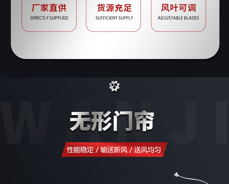 風幕機900型;長度900*145*185,功率100W,電壓220V,風速9-11,風量1310,噪音50,適合安裝高度不超過3米。