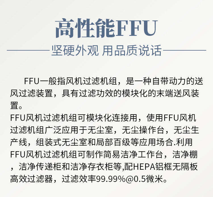 風機過濾機組是一種自帶動力的送風過濾裝置,英文全稱為(Fan Filter Unit),具有過濾功效的模塊化的末端送風裝置。風機過濾機組從頂部將空氣吸入和并經HEPA過濾,過濾后的潔凈空氣在整個出風面以0.45m/s±20%左右的速度均勻送出。